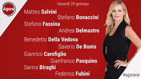 Tra gli ospiti di Luisella Costamagna: “Stefano Bonaccini (presidente Conferenza Regioni e Presidente Emilia Romagna, PD); Matteo Salvini (segretario della Lega); Stefano Fassina (Leu); Andrea Del Mastro (Fratelli d’Italia); Benedetto Della Vedova (segretario nazionale di Più Europa); Saverio De Bonis (senatore Gruppo Europeisti-Maie-Centro Democratico); Gianfranco Pasquino (professore Emerito di Scienza della Politica); Sarina Biraghi (La Verità); Federico Fubini (vicedirettore Corriere della Sera); Rita Cavallo (quirinalista Rai) e Gianrico Carofiglio (scrittore)”.