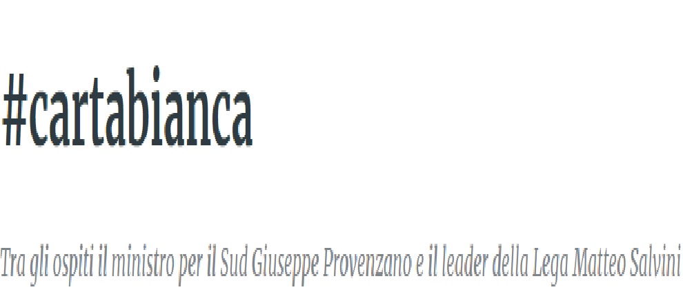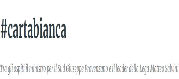 Il ministro per il Sud Giuseppe Provenzano e il leader della Lega Matteo Salvini sono tra i protagonisti della puntata di “#cartabianca”, in onda questa sera martedì 29 ottobre alle 21.20 su Rai3.