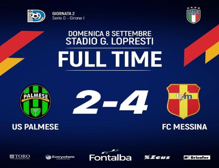 Con 4 goal, l’FC Messina, ha sconfitto oggi pomeriggio, l’US Palmese fuori casa. I padroni di casa neroverdi, nel contesto della gara disputata sono riusciti a segnare una rete. I giallorossi, hanno così potuto conquistare, i primi tre punti stagionali dopo il pari interno dell’esordio domenica scorsa contro il Licata. L’allenatore Costantino, ha apportato delle novità al 4-3-3 adottato come schema di gioco, inserendo Fissore, il quale (al centro della difesa) ha preso il posto di Quitadamo, andando a far coppia con Domenico Marchetti.