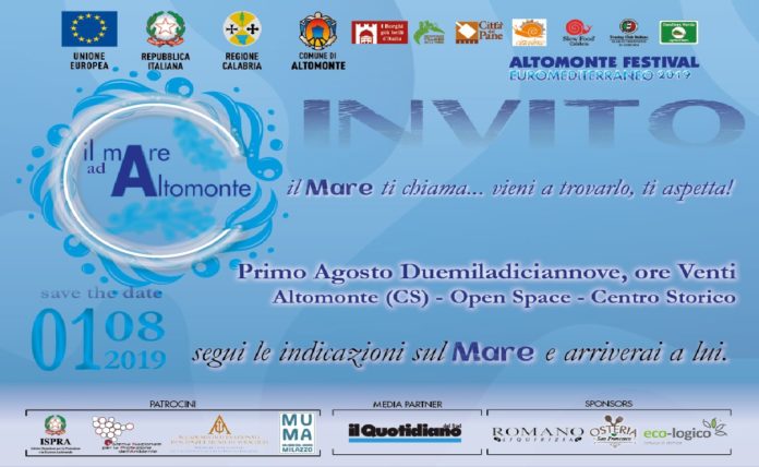 Il Mare ad Altomonte ha ottenuto il patrocinio dell’ISPRA (Istituto Superiore per la Protezione e la Ricerca Ambientale), SNPA (Sistema Nazionale per la Protezione dell’Ambiente), dell’AISTS (Accademia Internazionale di Scienze e Tecniche Subacquee) e del MuMa (Museo del Mare di Milazzo); ha come Media Partner il “Quotidiano del Sud” e come sponsors tre aziende del territorio che hanno fatto della tutela e valorizzazione dell’Ambiente il loro fulcro e la loro mission imprenditoriale: Romano Liquirizia, Osteria San Francesco e Eco-logico. Inaugurazione giovedì, primo agosto alle ore venti; seconda serata il 21 agosto con una performnce e un evento creativo che riguarderà e coinvolgerà i bambini che verranno: inizio ore venti con l’evento per i bambini. La terza data è quella del 30 agosto con l’ultima delle performance di Continuity Fluid Performers. Tutte le serate saranno a tema, ma questi saranno resi noti solo qualche giorno prima della data stabilita. Le mostre proseguiranno fino alla fine di settembre.