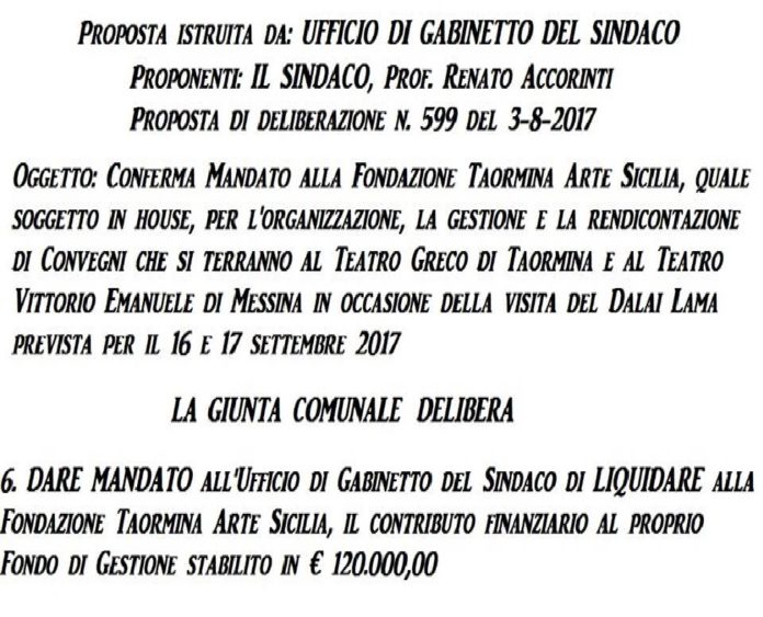 Mentre in città vi è un disagio sociale crescente, che dovrebbe far pensare ad altre priorità ed obiettivi, il sindaco Renato Accorinti e la sua Giunta pensano di dover destinare 120.000,00 € per la visita del “Dalai Lama”, a beneficio della “Fondazione TaoArte”, quale soggetto in house, per l’organizzazione, la gestione e la rendicontazione di Convegni che si terranno al Teatro Greco di Taormina e al Teatro Vittorio Emanuele di Messina, il 16 ed il 17 settembre prossimi.