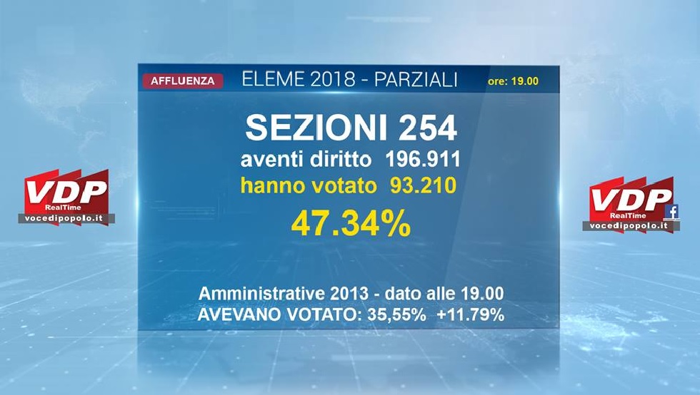 Il competente Ufficio del Servizio elettorale regionale, ha diffuso i dati relativi all’affluenza dei cittadini ai  254 seggi dislocati nella città di Messina. La percentuale raggiunta fino  a questo momento (ore 19) è pari al 47,34% degli aventi diritto al voto.