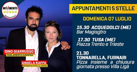 Ciao a tutti, domani, domenica (7 luglio) passeremo insieme a Dino Giarrusso dalla provincia di Messina. Questi i nostri appuntamenti a Tusa, Acquedolci e Tonnarella (Furnari). Chiunque voglia passare anche solo per conoscerci è benvenuto. Se volete avvicinare la sera e fermarvi a mangiare con noi una pizza, vi invito a farmelo sapere perché dobbiamo prenotare il tavolo e sapere quanti siamo. Buon fine settimana a tutti.