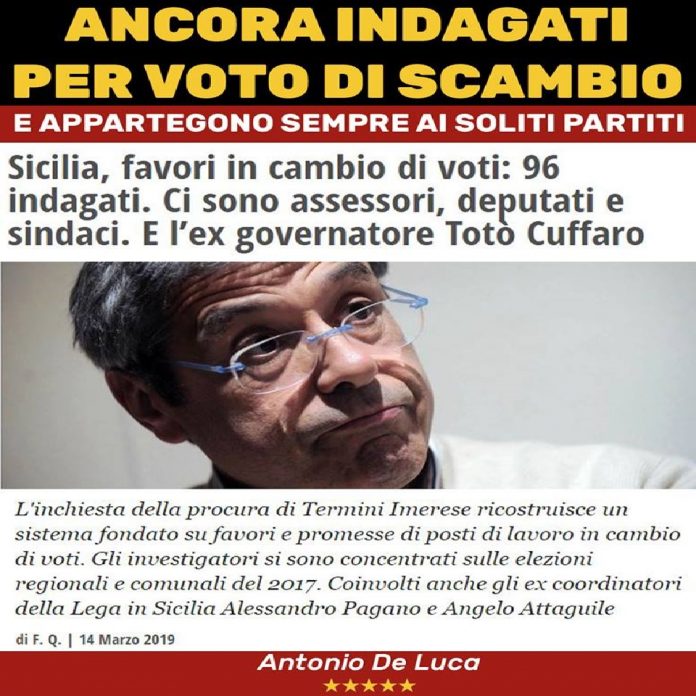 “L’ennesima indagine che vede coinvolti amministratori, assessori e politici, nell’ormai consolidato #VOTODISCAMBIO. Indagini su promesse elettorali, truffe ai fondi UE, posti di lavoro, incandidabili che provano a mettere in lista il proprio fratello per ingannare gli elettori, compravendita di esami e persino ammissioni nelle facoltà a numero chiuso. Volete sapere i partiti politici coinvolti? Sono sempre i soliti https://bit.ly/2CltK4z”.