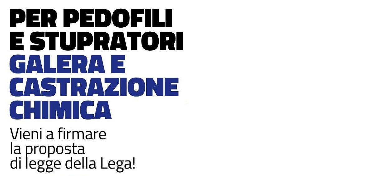 In una nota della Lega Sicilia, si evidenzia che: “arrivano i gazebo del Carroccio, per raccogliere le firme sulla proposta di legge relativa alla castrazione chimica. L’appuntamento, è a Barcellona Pozzo di Gotto ma non solo in quasi tutta la Provincia di Messina, sabato 4 maggio, nel comune di Condró, Pace del Mela e Torregrotta, domenica 5 maggio, nel comune di Barcellona Pozzo di Gotto, Milazzo (Mario Saporita) e Messina”.