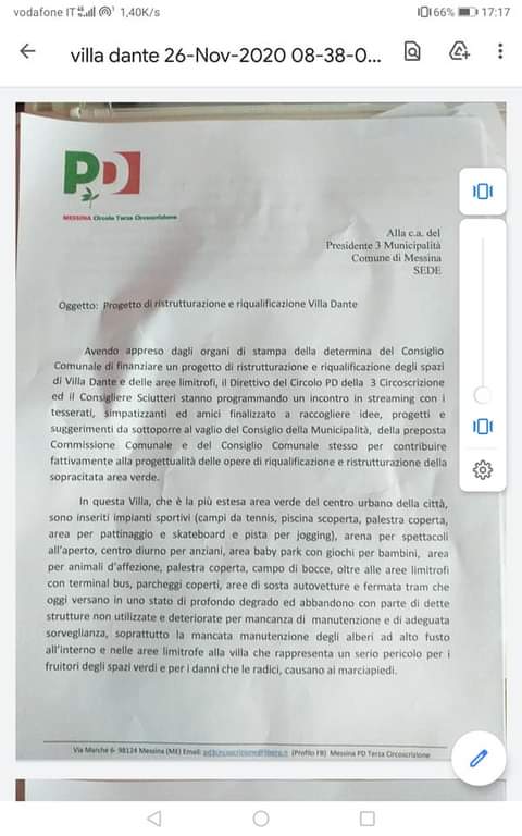 “Buon pomeriggio a tutti giorno 26 Novembre alle ore 11.00 si è tenuta una riunione nella Commissione della Terza Municipalità relativamente all’argomento Villa Dante. Noi come Circolo PD 3 Circoscrizione abbiamo presentato un documento a firma del nostro Segretario di Circolo Dott. Labate e del Consigliere A. Sciutteri, riservandoci di fornire ulteriori idee che scaturiranno da un incontro in Videoconferenza che terremo a breve su Teams con i componenti del Direttivo e gli iscritti. In allegato il documento che è stato presentato in Commissione”. Hanno scritto cosi’ oggi su Facebook, i responsabili del sodalizio piddino di Messina.