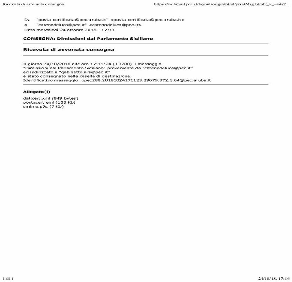 Infatti oggi pomeriggio, alle ore 17, De Luca ha formalizzato l’atto di rinuncia allo scranno trasmettendolo all’Ufficio di Gabinetto dell’Assemblea regionale siciliana, come ha fatto vedere lui stesso sulla pagina Facebook che da tempo usa per comunicare le sue azioni giornaliere.