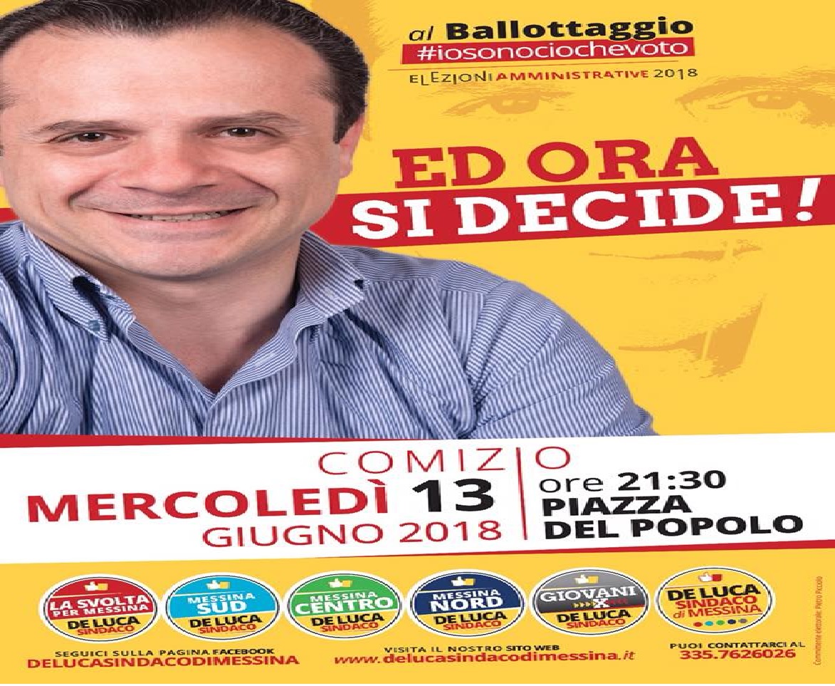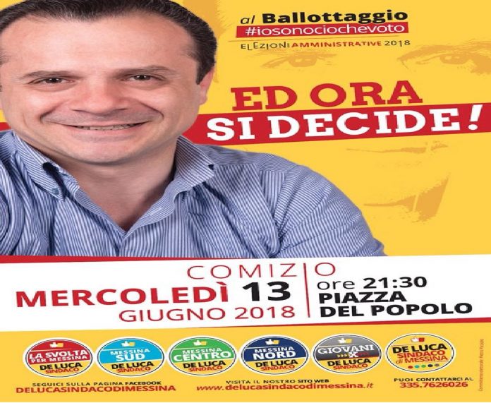 Cateno De Luca, candidato sindaco per Palazzo Zanca, ha scritto questo post su Facebook, in riferimento all’appuntamento odierno di piazza Francesco Lo Sardo: “non potete mancare! Stasera la diretta del comizio verrà trasmessa su Tremedia canale 112 del digitale terrestre”.