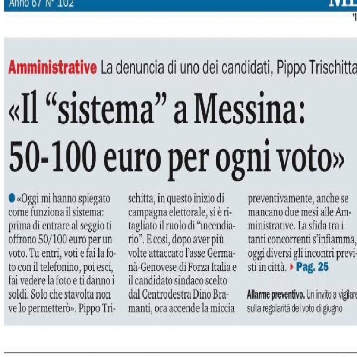 Dopo il post pubblicato ieri da Giuseppe Trischitta (ex consigliere comunale di Messina e candidato sindaco), nel quale evidenziava il metodo usato da qualcuno per comprare i voti, specificando che questa volta (il prossimo 10 giugno), non lo consentirà presentando denuncia, interviene uno degli altri contendenti alla poltrona principale di Palazzo Zanca, ovvero Cateno De Luca che afferma: “perché il buon Pippo Trischitta non fa nomi e cognomi? Forse perché fino a qualche mese fa era il capogruppo di un Partito coinvolto anche in gettonopoli di cui egli era complice perché sapeva ma ha taciuto?”.