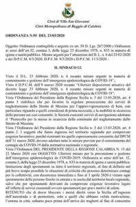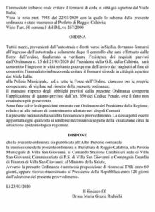 La sindaca facente funzioni di Villa San Giovanni (RC), Maria Grazia Richichi, ha firmato e diffuso ieri, l’Ordinanza che segue: “tutti i mezzi, provenienti dall’autostrada e diretti verso la Sicilia, dovranno fermarsi all’ingresso dell’autostrada e solamente dopo il controllo che sarà effettuato dalle Forze dell’ordine, finalizzato a verificare l’esistenza dei requisiti previsti dall’Ordinanza n. 15 del 21/03/2020 del Presidente della G.R. della Calabria, sarà consentito l’ingresso in città soltanto poco prima dell’arrivo dei traghetti al fine di consentire l’immediato imbarco onde evitare il formarsi di code in città già a partire dal Viale Italia; alla Polizia Municipale, ed a tutte le Forze dell’Ordine, ciascuno per le proprie competenze, di vigilare sul rispetto della presente ordinanza; Il mancato rispetto degli obblighi previsti dalla presente Ordinanza comporta l’applicazione di quanto previsto dall’art. 650 del Codice Penale, ove il fatto non costituisca più grave reato”.