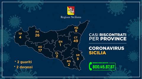 In totale sono 115 i pazienti, di cui 33 ricoverati (cinque in terapia intensiva), 78 in isolamento domiciliare, due guariti e due deceduti: #Agrigento, 17; #Caltanissetta, 2; #Catania, 49; #Enna, 1; #Messina, 9; #Palermo, 26; #Ragusa, 2; #Siracusa, 5; #Trapani, 4.