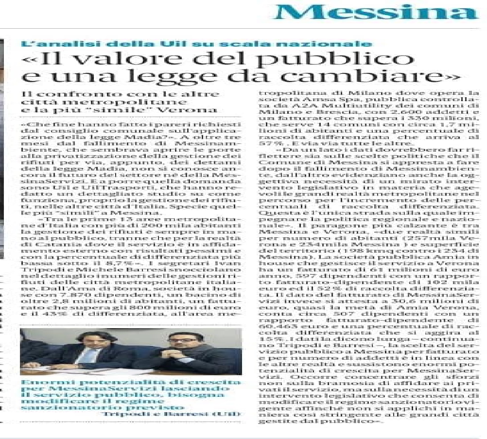 A scriverlo, è l’assessora all’Ambiente della Giunta De Luca di Messina, Dafne Musolino: “secondo la UIL la gestione pubblica del servizio di raccolta rifiuti è la migliore possibile. E per dimostrarlo paragona Messina a Verona. Ma lo studio di cui la UIL riporta le conclusioni non conferma la tesi del Sindacato, anzi dimostra quanto sia stato sbagliato e strumentale il diniego della UIL all’approvazione della nuova Pianta Organica”!