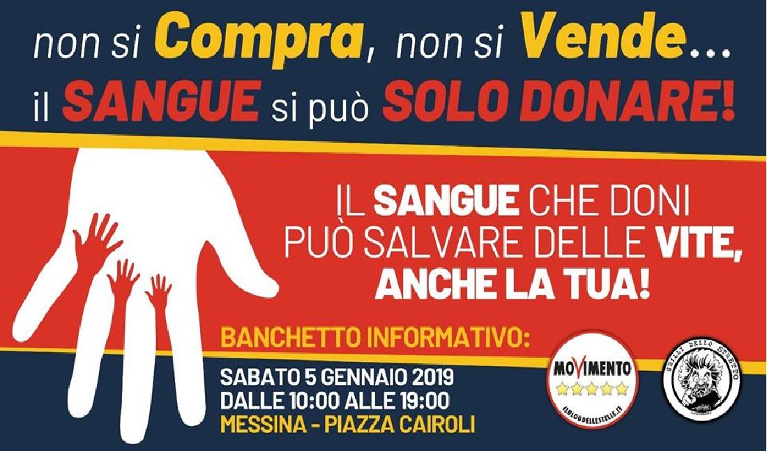 Si terrà domani, venerdì 4 Gennaio, alle ore 10, presso la “Sala Ovale” del Comune di Messina, la conferenza stampa di presentazione del “Banchetto informativo sulla donazione sangue a Messina”, la prima di una serie di iniziative promosse dal MoVimento 5 Stelle per sensibilizzare la cittadinanza su un tema di vitale importanza per la collettività e per incentivare la donazione in una città in cui i numeri per l’offerta di sangue sono fra i più bassi d’Italia.
