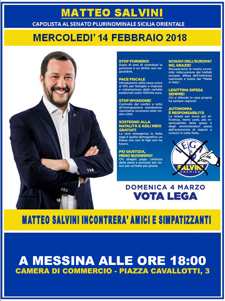 Il leader della Lega e candidato premier, Matteo Salvini, capolista al Senato per la Sicilia Orientale, domani, mercoledì 14 febbraio alle ore 15.00, terrà una conferenza stampa a Paternò, Palazzo Alessi, sede del Municipio, situato in piazza Umberto I, dove sarà peraltro ricevuto dal sindaco, dalla Giunta e dal Consiglio Comunale.