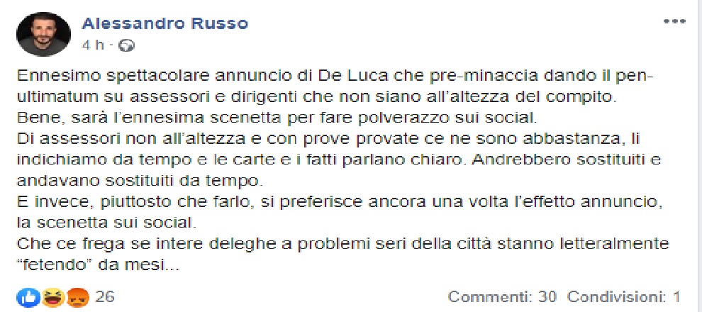 Ecco come ha proseguito Russo: “bene, sarà l’ennesima scenetta per fare polverazzo sui social. Di assessori non all’altezza e con prove provate ce ne sono abbastanza, li indichiamo da tempo e le carte e i fatti parlano chiaro. Andrebbero sostituiti e andavano sostituiti da tempo. E invece, piuttosto che farlo, si preferisce ancora una volta l’effetto annuncio, la scenetta sui social. Che ce frega se intere deleghe a problemi seri della città stanno letteralmente -fetendo- da mesi…”.