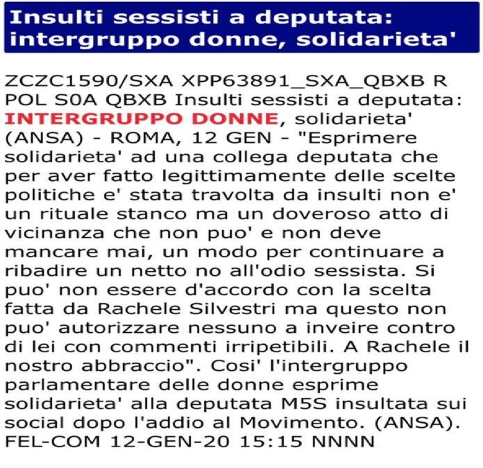 “Esprimere solidarietà ad una collega deputata, che per avere fatto scelte politiche è stata travolta da insulti non è un rituale stanco, ma un doveroso atto di vicinanza che non puo’ e non deve mancare mai, un modo per continuare a ribadire un netto no all’odio sessista”. Si esprimono così le deputate dell’Intergruppo donne di Monte Citorio per manifestare la loro solidarietà alla collega Rachele Silvestri, ricoperta di ingiurie dopo essere uscita dal M5S.