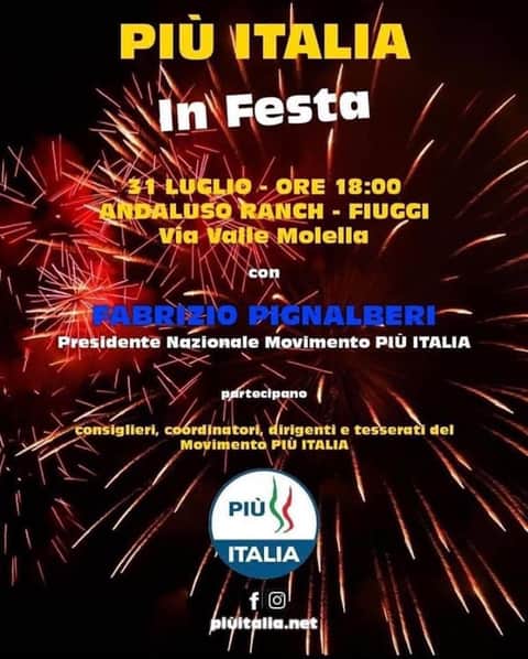 Il Movimento Piu’ Italia…, in Festa con il suo presidente nazionale Fabrizio Pignalberi. Venerdi’ 31 luglio, alle ore 18.00, presso l’Andaluso Ranch di via Valle Molella a Fiuggi, si terra’ un incontro degli appartenenti al sodalizio politico.