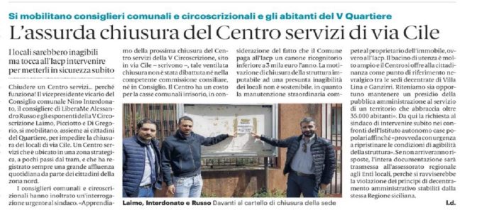 I consiglieri comunali Russo ed Interdonato (vice presidente vicario) assieme consiglieri della Quinta circoscrizione Laimo, Picciotto e Di Gregorio, si palesano contrari alla chiusura dell’importante centro servizi di via Cile Ubicato in una zona strategica (a pochi passi dal tram), e che ha visto l’affluenza fino al giorno della chiusura, di tutta la cittadinanza della zona nord. Gli stessi consiglieri interrogano il sindaco on. De Luca sulla non poco discussa chiusura del centro. Intanto i cittadini si mobilitano e sono pronti a manifestare.