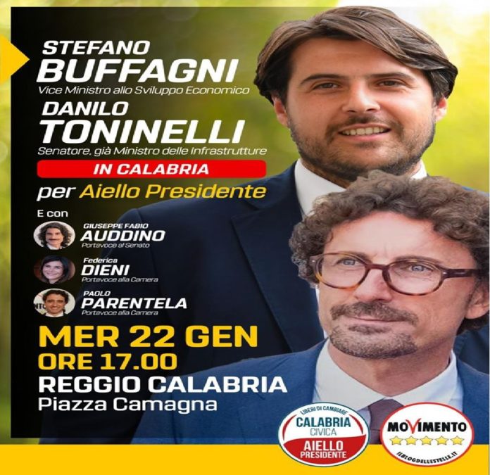 Continua così, la nota dei grillini: “prenderanno parte all’incontro il candidato alla Regione Francesco Aiello, il viceministro allo Sviluppo Economico Stefano Buffagni, il senatore (nonché ex ministro delle Infrastrutture) Danilo Toninelli. Saranno presenti anche i parlamentari calabresi Giuseppe Auddino, Paolo Parentela e Federica Dieni. #LiberiDiCambiare #AielloPresidente”.