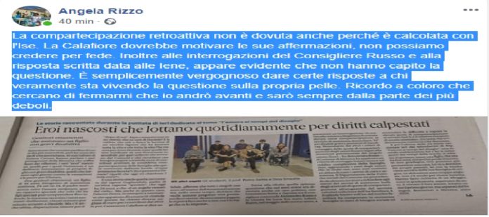 “La compartecipazione retroattiva, non è dovuta anche perché è calcolata con l’Ise”. Ad esprimersi così, in un post pubblicato stamani su Facebook è l’esperta del Terzo Settore a Messina, Angela Rizzo.