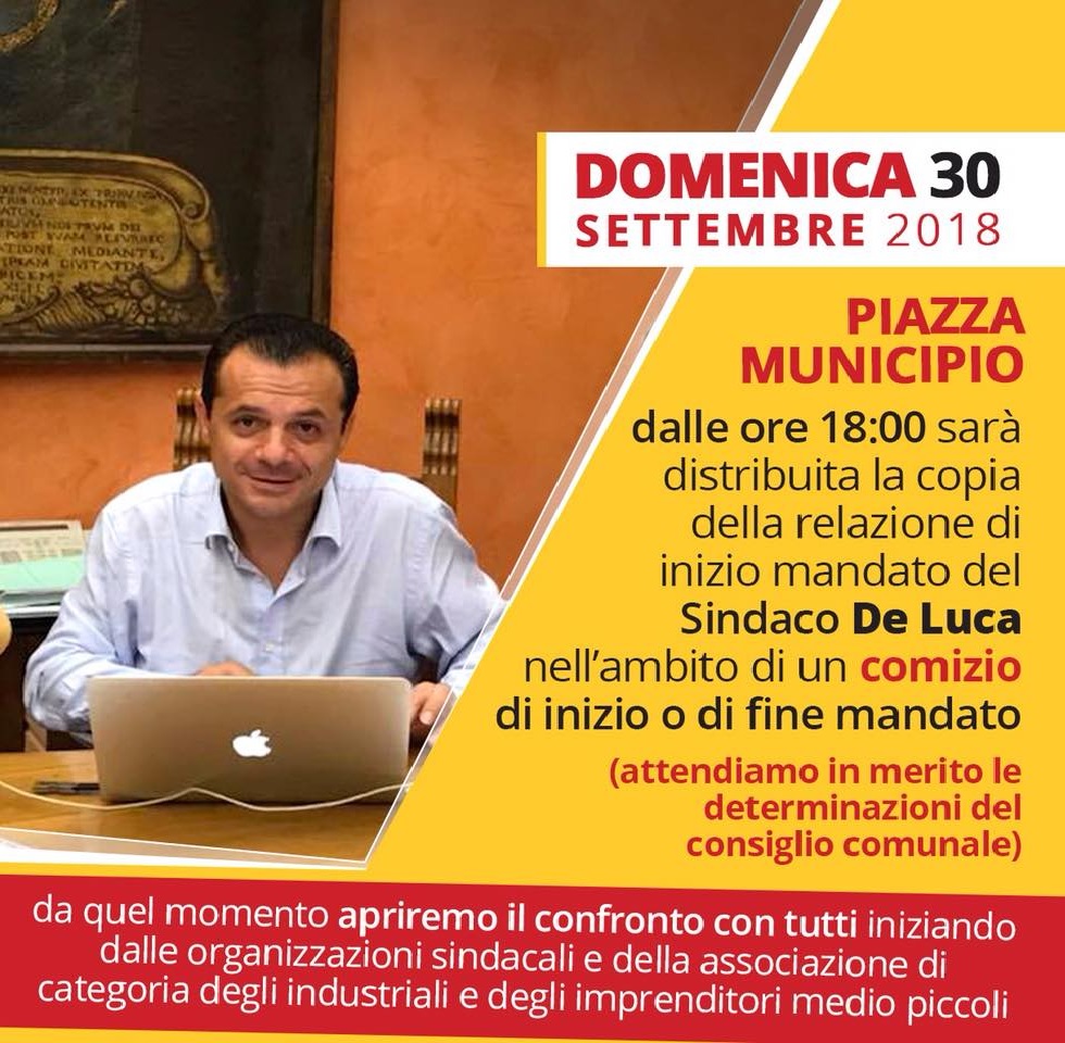 De Luca, scrive che: “sarà distribuita la copia di questo documento, nell’ambito di un comizio di inizio o fine mandato (attendiamo in merito le determinazioni del Consiglio Comunale)”.
