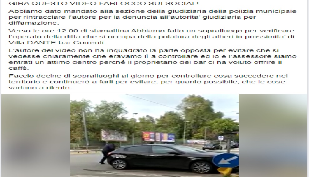 “Abbiamo dato mandato alla sezione della giudiziaria della polizia municipale per rintracciare l’autore per la denuncia all’autorità giudiziaria per diffamazione. Verso le ore 12.00 di stamattina abbiamo fatto un sopralluogo per verificare l’operato della ditta che si occupa della potatura degli alberi in prossimità di Villa DANTE bar Correnti. L’autore del video non ha inquadrato la parte opposta per evitare che si vedesse chiaramente che eravamo lì a controllare ed io e l’assessore siamo entrati un attimo dentro perché il proprietario del bar ci ha voluto offrire il caffè”.
