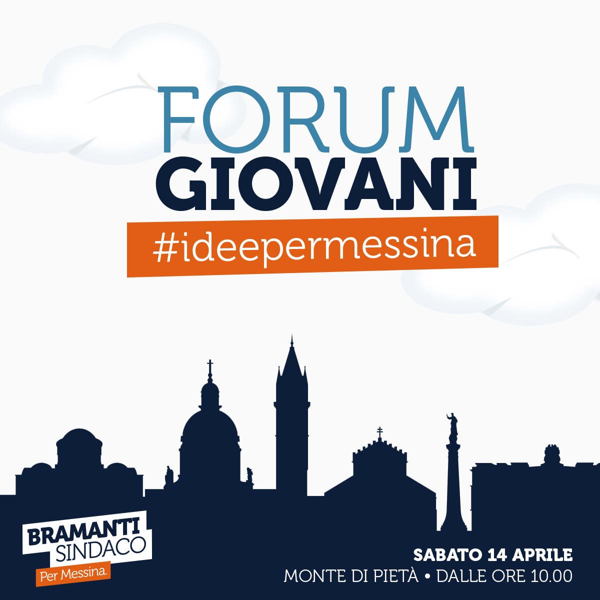 “L’evento si terrà sabato 14 aprile ALLE 10.00 AL MONTE DI PIETÀ, alla presenza dei duecento giovani che hanno aderito al Forum e di quanti vorranno ancora dare il loro contributo di idee per Messina. Subito dopo gli interventi dell’assessore Razza e del candidato sindaco Bramanti si definiranno i 4 gruppi relativi alle aree tematiche, in modo da poter definire il piano delle attività”.