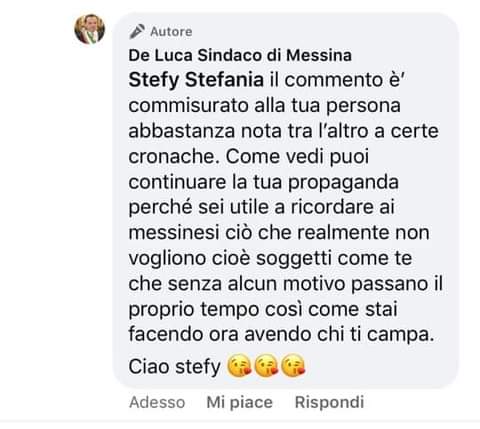 Lo ha scritto oggi su Facebook, Francesco Argento l’amministratore del Gruppo -Cateno De Luca non mi rappresenta-: “ecco il commento che ha decretato il blocco della pagina del sindaco De Luca Sindaco di Messina giudicato sessista dagli operatori della sede londinese di Facebook. Il commento è stato segnalato da più di 2000 utenti indignati e Facebook è corsa ai ripari limitando l’uso della suddetta pagina. e cancellando i commenti offensivi inseriti dal sindaco stesso”.