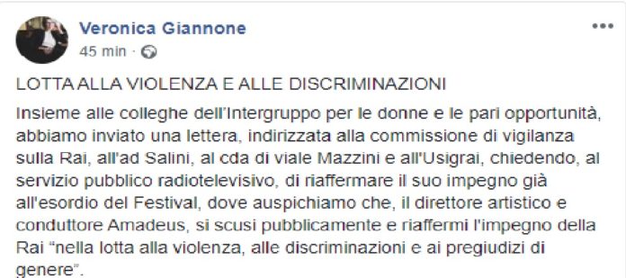 SCRIVE COSI' OGGI IN UNA NOTA, LA DEPUTATA DI LECCE, DEL GRUPPO MISTO DI MONTE CITORIO... VERONICA GIANNONE, PER EVIDENZIARE LA RICHIESTA AVANZATA A DIVERSI SOGGETTI, AFFINCHE' IL CONDUTTORE DEL FESTIVAL DI SANREMO AMADEUS SI SCUSI PUBBLICAMENTE