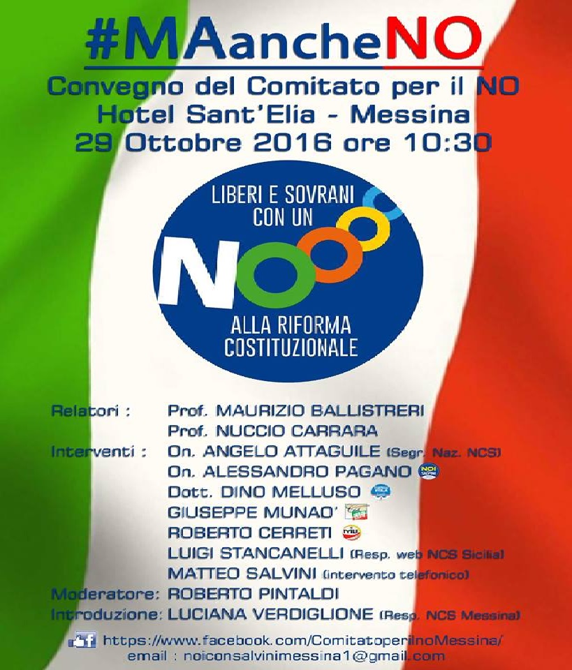 Il Comitato per il No al referendum del 4 dicembre, vuole informare i cittadini della comunità peloritana, sulle proprie ragioni per il No, in una nota sottolinea: “domani, sabato 29 ottobre, alle ore 10.30 presso l’Hotel Sant’Elia di Messina in via primo Settembre, il Comitato per il No al referendum costituzionale previsto il prossimo 4 dicembre, terrà un incontro denominato MA anche NO. Liberi e sovrani, con un NO alla Riforma costituzionale”.