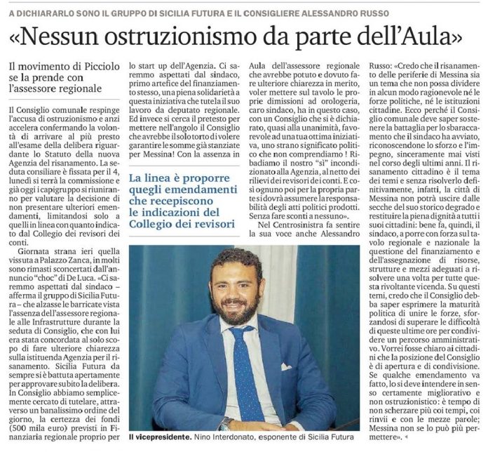 Nino Interdonato, vice presidente dell’Assise di Palazzo Zanca, in una nota pubblicata su Facebook, riguardo all’iter sulla costituzione del nuovo soggetto unico per l’eliminazione delle baracche post terremoto di Messina, specifica: “il Consiglio ha semplicemente cercato di tutelare, attraverso un banalissimo Ordine del Giorno, la certezza e la velocità di erogazione dei fondi (500mila €) previsti in Finanziaria regionale votando quindi contrariamenente all’emendamento cassativo del sindaco”.