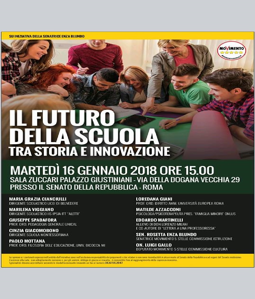 Quest’oggi alle ore 15, a Palazzo Giustiniani, sede del Senato della Repubblica nella Sala Zuccari, è previsto l’appuntamento con un importante convegno organizzato dalla senatrice del MoVimento Cinque Stelle, Rosetta Enza Blundo, dal titolo: “Il futuro della Scuola, tra storia e innovazione”.