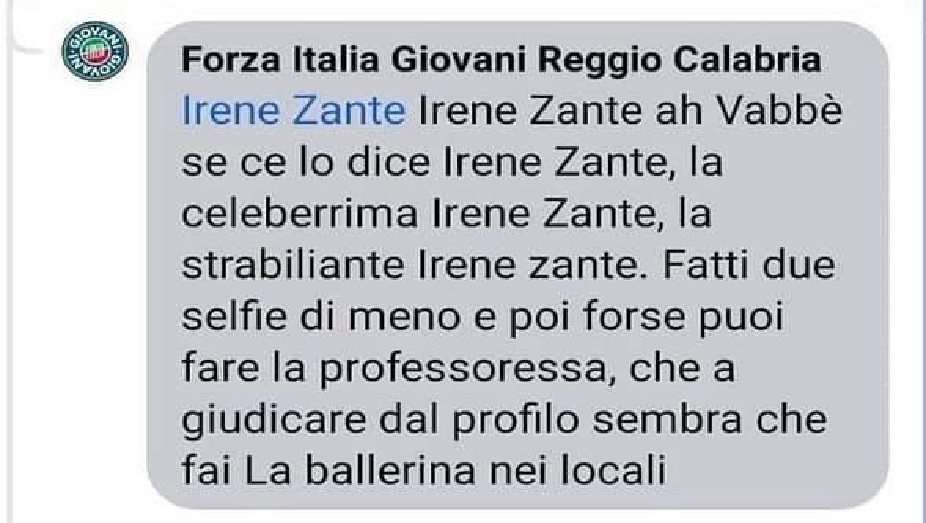 “Purtroppo quando c’è poco contenuto si scade in polemiche sterili ed insulti personali che poco hanno a che vedere con il confronto politico e costruttivo che tanto viene decantato”. Ha scritto in tal modo ieri su Facebook Irene Zante di Reggio Calabria, finita al centro di attacchi sessisti rivoltigli dai responsabili che gestiscono la Pagina della locale Sezione di Forza Italia Giovani.