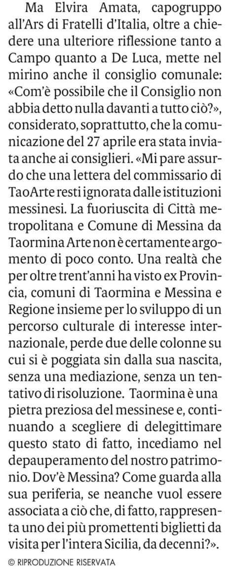 “Qualcuno ha letto il mio commento di ieri come un attacco personale; non lo era. Ho rivolto un appello al confronto e al buonsenso. Ma è essenziale un richiamo al senso di responsabilità e mi sono sentita in dovere di lanciare un messaggio forte a tutte le parti in causa”. Lo ha scritto oggi on line, l’onorevole regionale di Fratelli d’Italia, Elvira Amata, in merito alla vicenda di questi giorni che riguarda Taormina Arte.