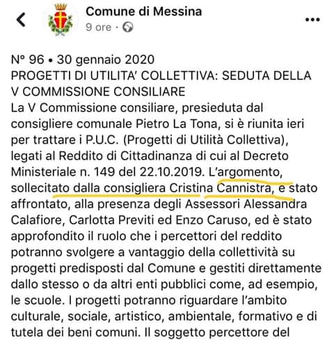 La V^ Commissione consiliare del Municipio di Messina, presieduta dal consigliere comunale Pietro La Tona, si è riunita ieri per trattare i P.U.C. (Progetti di Utilità Collettiva), legati al Reddito di Cittadinanza di cui al Decreto Ministeriale n. 149 del 22.10.2019.