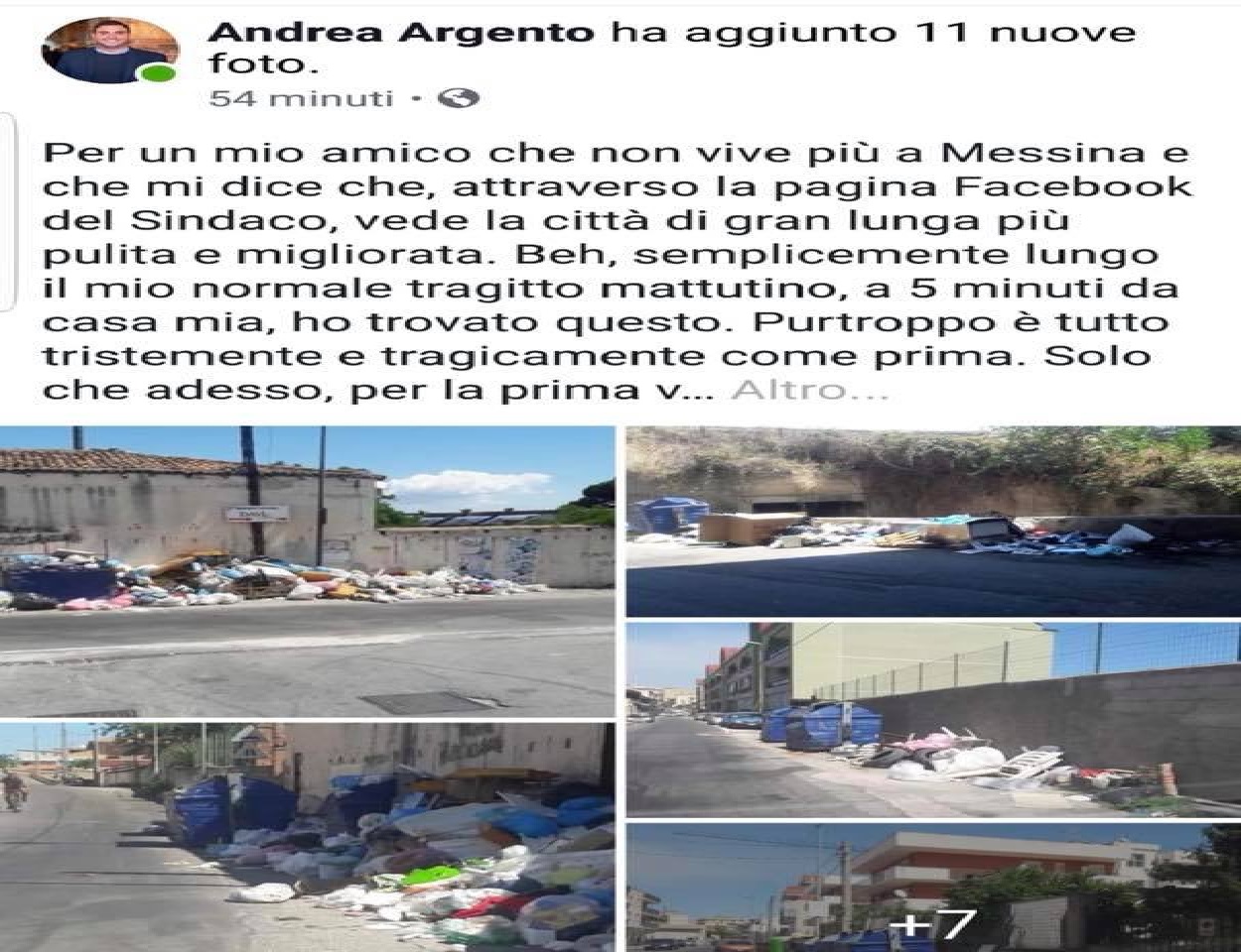 “Posso affermare senza tema di smentita, che ogni sito sotto indicato dal sotto i capelli niente, dopo che viene bonificato, ritorna ad essere una discarica a distanza di qualche giorno a causa di alcuni messinesi sporchi nell’anima”.