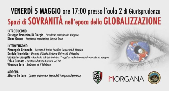 L’Associazione “Morgana”, oggi, venerdì 5 maggio alle ore 17, terrà presso l’aula 2 di Giurisprudenza dell’Ateneo peloritano, il Convegno dal titolo: “Spazi di sovranità nell’epoca della globalizzazione”.