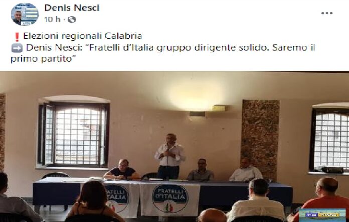 “Stiamo lavorando alla costruzione della lista di Fratelli d’Italia della Circoscrizione Sud. Valori e idee che rispecchiano l’identità del partito per ‘lanciare’ una squadra di uomini e donne che avranno il compito di rappresentarlo alle prossime elezioni regionali di autunno. Non ci nascondiamo. Puntiamo ad essere il primo partito, in Calabria e soprattutto a Reggio Calabria”. E’ quanto scrive in una nota Denis Nesci, Commissario provinciale Fratelli d’Italia a Reggio Calabria.