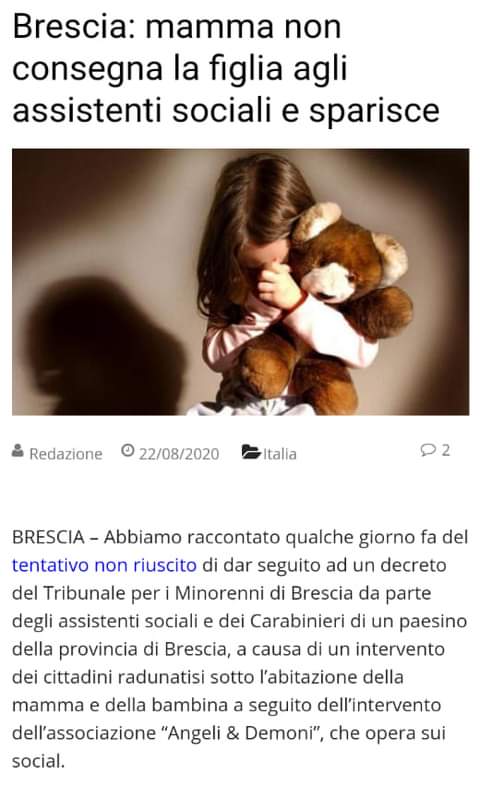 “Una mamma della provincia di Brescia è fuggita con la figlia per non consegnarla agli assistenti sociali”. A riferirlo oggi, su Facebook, è stata l’onorevole pugliese di Montecitorio, afferente al Gruppo Misto, Veronica Giannone.