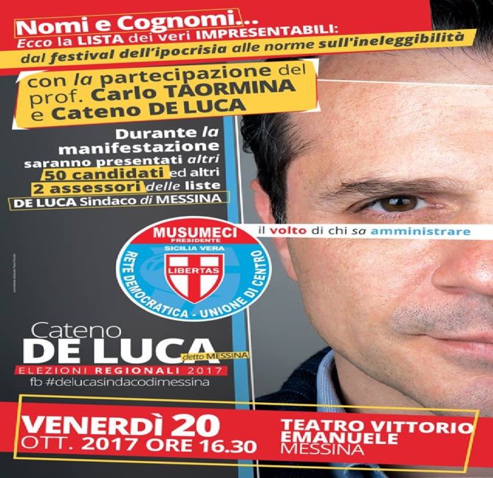 Dallo staff dell’ex sindaco di Santa Teresa di Riva, candidato nella Lista “Sicilia Vera – Udc” per le prossime elezioni regionali del 5 novembre giunge una nota nella quale si evidenzia che: “si svolgerà domani venerdì 20 ottobre alle ore 16.30 al Teatro Vittorio Emanuele di Messina una convention di Cateno De Luca con la partecipazione del prof. Carlo Taormina dove sarà illustrata la lista dei veri -impresentabili- in politica e si discuterà sulle norme relative all’ineleggibilità”.