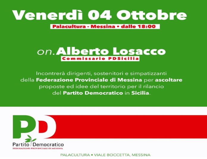 Venerdì 4 ottobre a Messina, dalle 18.00 al Palacultura di viale boccetta, il commissario del Pd siciliano on. Alberto Losacco, in vista del congresso regionale, incontra i simpatizzanti, gli iscritti ed i dirigenti, aprendo così la stagione del tesseramento. Messina sarà la prima tappa siciliana del commissario.