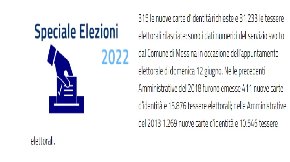 315 le nuove carte d’identità richieste e 31.233 le tessere elettorali rilasciate: sono i dati numerici del servizio svolto dal Comune di Messina in occasione dell’appuntamento elettorale di domenica 12 giugno.