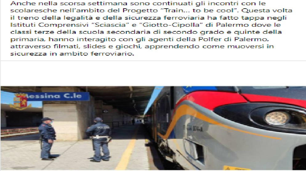 Anche nella scorsa settimana sono continuati gli incontri con le scolaresche nell’ambito del Progetto “Train… to be cool”. Questa volta il treno della legalità e della sicurezza ferroviaria ha fatto tappa negli Istituti Comprensivi “Sciascia” e “Giotto-Cipolla” di Palermo dove le classi terze della scuola secondaria di secondo grado e quinte della primaria, hanno interagito con gli agenti della Polfer di Palermo, attraverso filmati, slides e giochi, apprendendo come muoversi in sicurezza in ambito ferroviario.