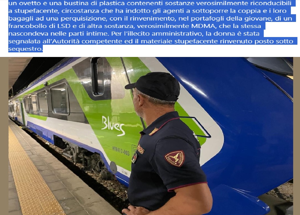 A Messina, il fiuto del cane antidroga “EDIPO”, ha consentito di individuare, tra i tanti viaggiatori, due giovani 26enni, un uomo e una donna entrambi di nazionalità iraniana, mentre cercavano di guadagnare l’uscita dalla stazione evitando il controllo di Polizia. La donna, alla vista degli agenti e dell’unità cinofila, ha spontaneamente consegnato un ovetto e una bustina di plastica contenenti sostanze verosimilmente riconducibili a stupefacente, circostanza che ha indotto gli agenti a sottoporre la coppia e i loro bagagli ad una perquisizione, con il rinvenimento, nel portafogli della giovane, di un francobollo di LSD e di altra sostanza, verosimilmente MDMA, che la stessa nascondeva nelle parti intime. Per l’illecito amministrativo, la donna è stata segnalata all’Autorità competente ed il materiale stupefacente rinvenuto posto sotto sequestro.