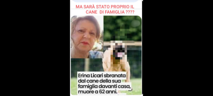 ‘Il figlio e il marito hanno trovato così il corpo di Erina Licari e il cane accucciato vicino a lei, un meticcio di maremmano di grossa taglia, il cane era sporco di sangue: ma quello è il sangue di Erina? Ci sono dubbi che attanagliano la famiglia e tutto il paese incredulo’.