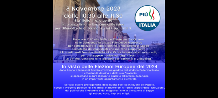 “8 Novembre 2023 dalle 10.30 alle 11.30 Più Italia’ tra la gente in piazza Unione Europea a Messina per difendere la cittadinanza ed i suoi Diritti”