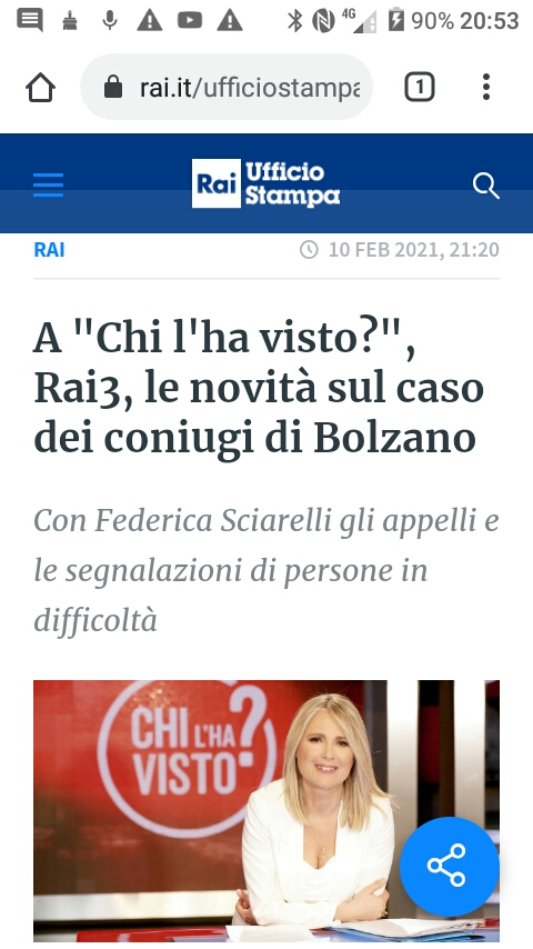 Mercoledì 10 febbraio alle 21.20 su Rai3, nuova puntata di “Chi l’ha visto?” con gli ultimi aggiornamenti, gli inviati sul posto e servizi filmati, sul caso dei coniugi di Bolzano e del figlio Benno che è in carcere accusato di duplice omicidio.