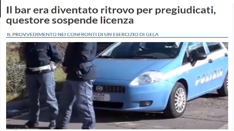 A Gela un bar era diventato abituale ritrovo di pregiudicati e per questo il questore Emanuele Ricifari ha sospeso la licenza, facendo leva sull’ex articolo 100 del Tulps, il testo unico delle leggi di pubblica sicurezza. La sospensione avrà una validità di sette giorni. Il provvedimento si è reso necessario “al fine di evitare che l’esercizio continui ad essere abituale ritrovo di persone che possano costituire pericolo per l’ordine e la sicurezza pubblica”.