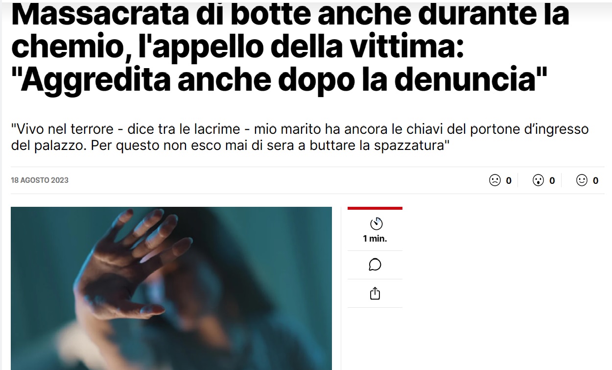 «A meno di una settimana dalla mia richiesta di aiuto, a fronte del silenzio delle istituzioni, ho dovuto subire non solo un’aggressione in strada, ma in violazione dell’ordinanza del giudice mi è stato sottratto mio figlio… a nulla è servito l’intervento delle forze dell’ordine che mi hanno invitato “a chiudere un occhio”… sconvolta per la risposta ho avuto un malore ed è intervenuta anche l’ambulanza del 118»: è lo sfogo di una donna di 38 anni di origini ennesi, residente a Caltanissetta, che, affetta da un tumore, è stata picchiata e maltrattata ripetutamente, anche durante la chemioterapia. Ha denunciato il marito un anno e mezzo fa senza ottenere alcun provvedimento dalla magistratura e a nulla è servito l’appello di pochi giorni fa sui giornali.