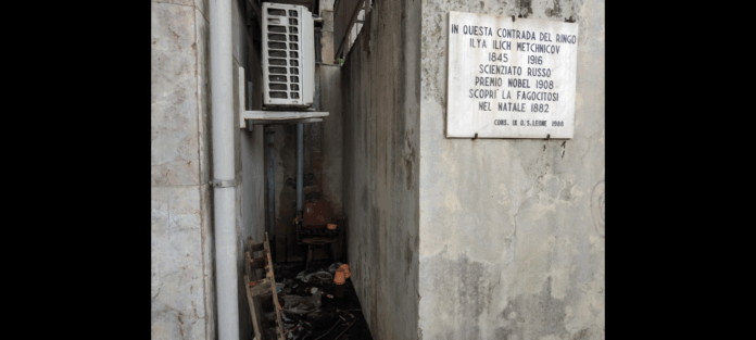 Il descritto liquido nauseabondo, precipita dall’alto e si riversa sul sottostante marciapiede tra una Profumeria e la vecchia Edicola (abbandonata da anni) proprio di fronte agli Scali marittimi della ‘Caronte & Tourist’.